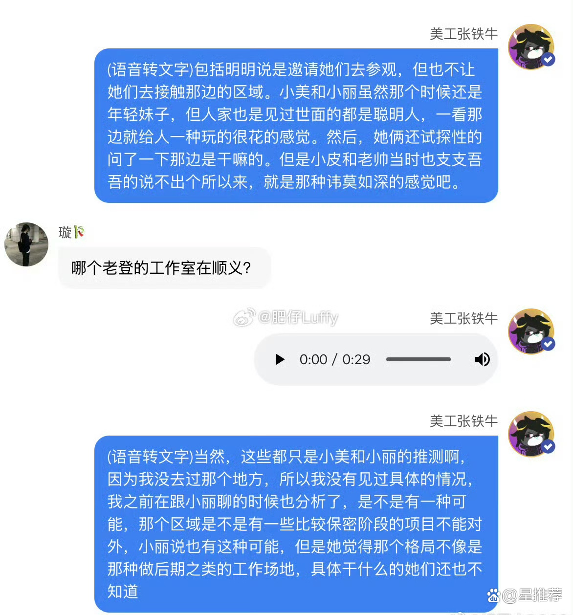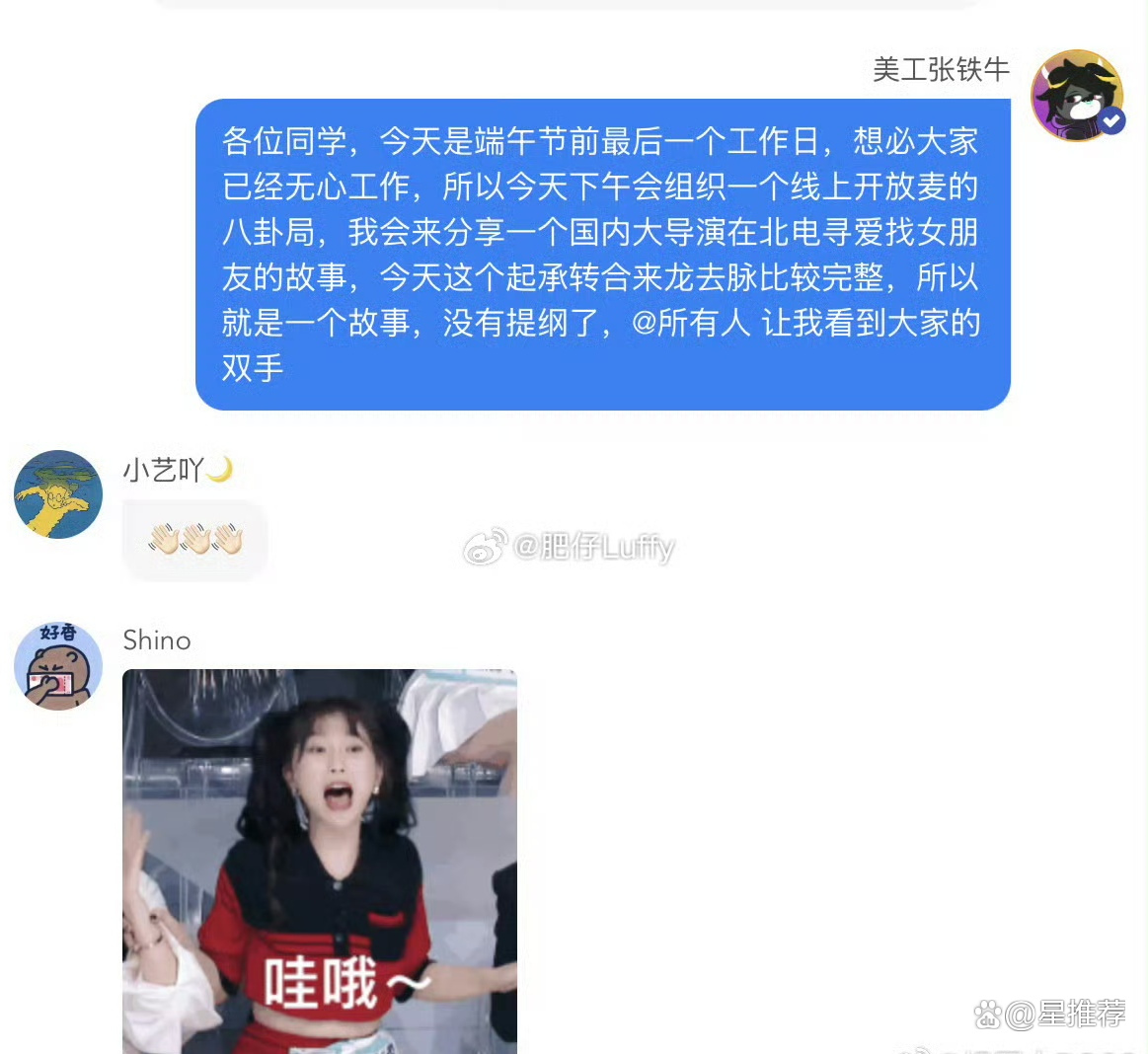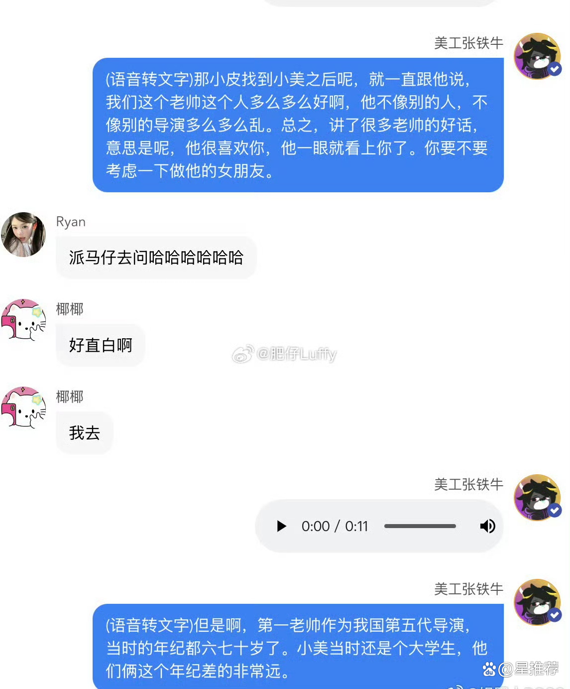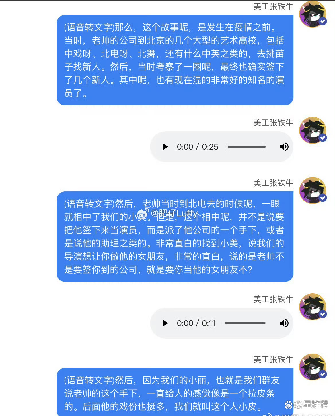 日前,博主“美工張鐵牛”轉述此事件的經歷身份為北電學生的小麗曝光的聊天記錄,該小麗是小美的同學。陪同小美參觀爆料中的第五代導演“老帥”的公司,對老帥公司的神秘區域存疑。小皮的身份是老帥的手下 / 助理,負責向小美傳達老帥的意圖,被小麗評價像 “拉皮條的”,后續多次到學校打探小美的消息。