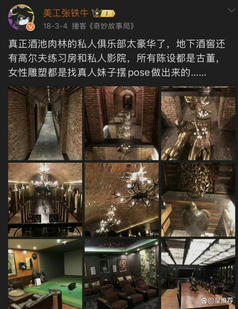 私人俱樂部,真正酒池肉林的私人俱樂部太豪華了,地下酒窖還有高爾夫練習房和私人影院,所有陳設都是古董,女性雕塑都是找真人妹子擺pose做出來的……