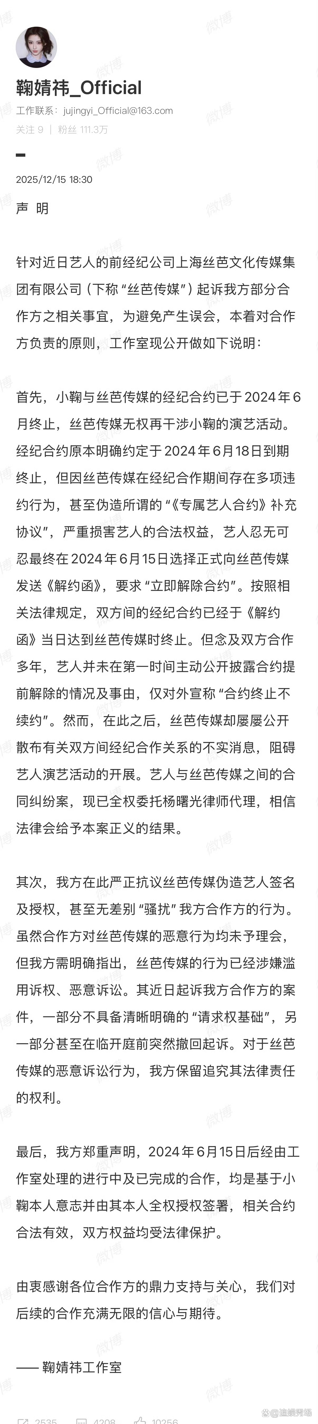 12月15日,鞠婧祎工作室于發布聲明,首次詳細披露與絲芭傳媒合約提前終止的核心爭議,指控對方偽造協議、惡意訴訟,引發輿論對經紀公司霸王條款的廣泛質疑。