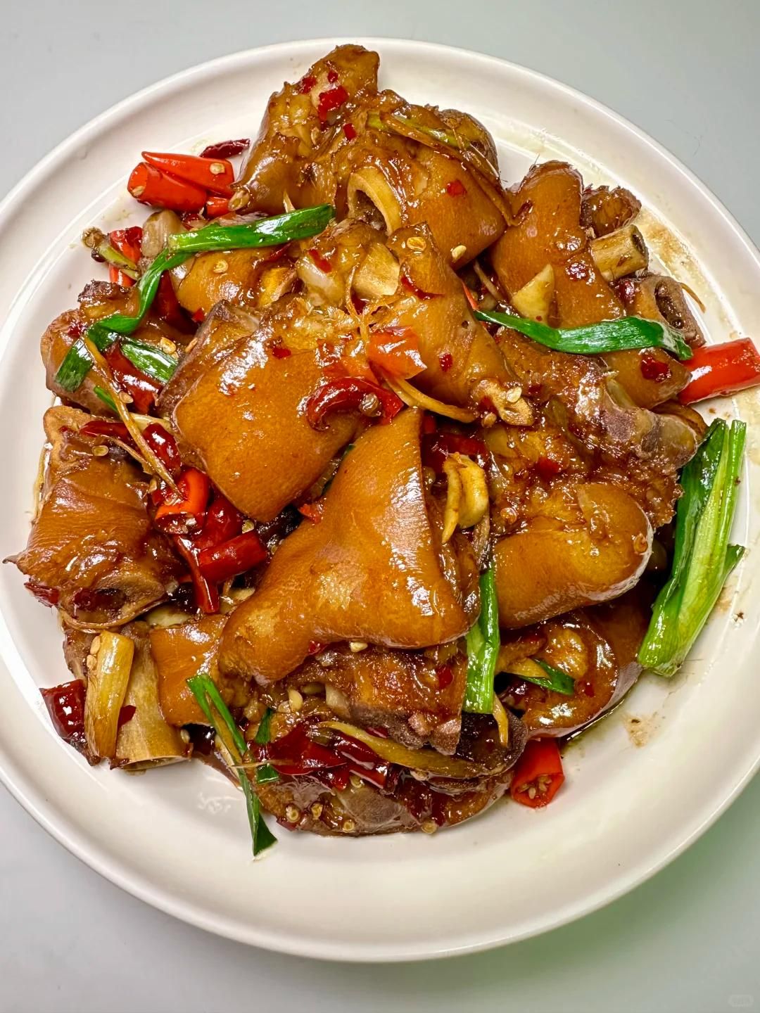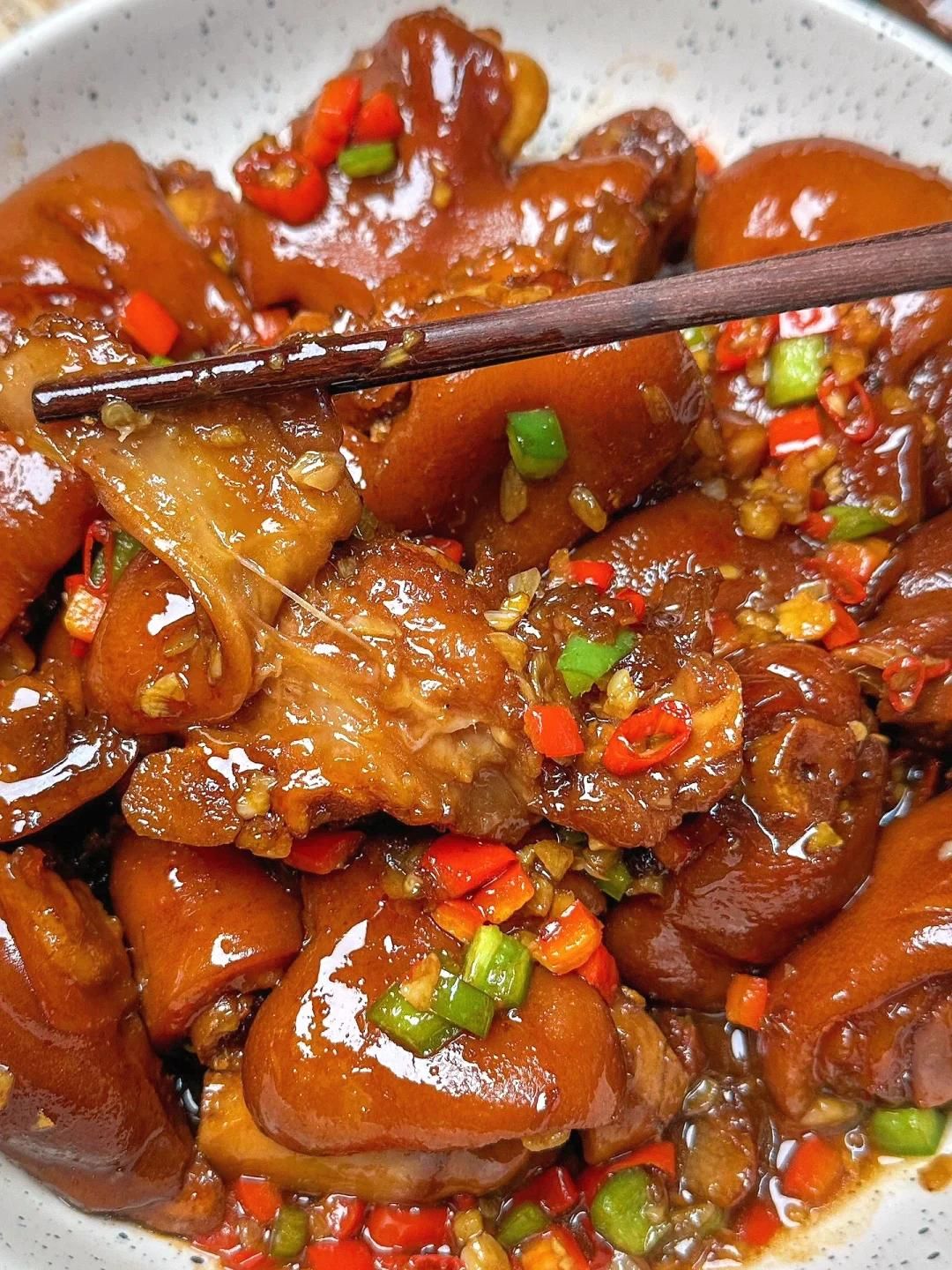 等豬蹄能輕松脫骨時,關火!別急著吃,讓它們在余溫里"睡"半小時。這期間膠質會重新排列組合,就像給豬蹄敷面膜。