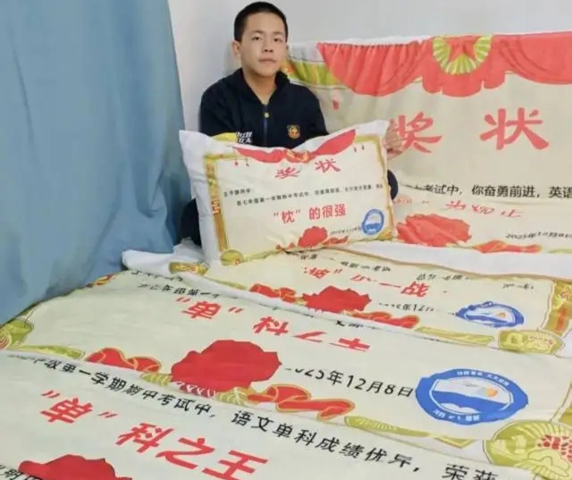 這場“獎狀革命”的主角,是706班班主任蔣琰和903班班主任胡國洋。她們把“榮譽”從紙張搬到了日用品上:總分前五的孩子,能抱回一套印著“卷王戰袍”的被套;進步幅度最大的,是“枕的很強”的成長之枕;單科突出的“單科之王”,會收到“學霸認證”被單;就連最佳課代表的獎品,都是諧音梗拉滿的“知梳達禮”木梳,最佳小組的抱枕則叫“抱團取暖”。每一件物品上,都印著學生的名字,把“定制榮譽”焊在了日常里。
