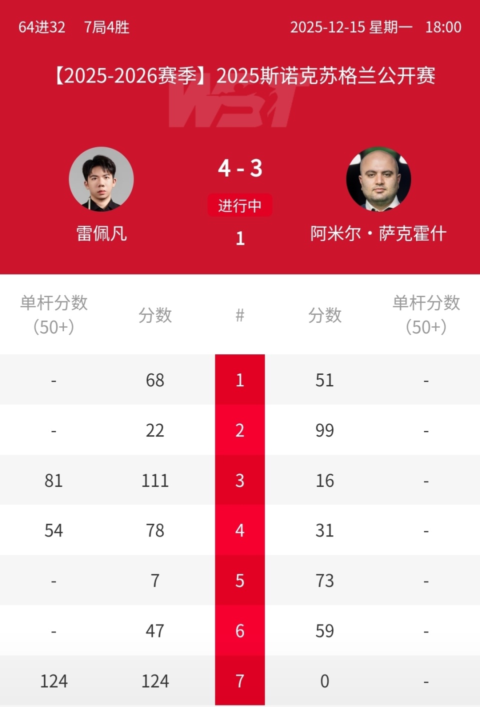 北京時(shí)間12月16日凌晨,2025年斯諾克蘇格蘭公開賽正式開桿。揭幕戰(zhàn),中國名將+衛(wèi)冕冠軍雷佩凡強(qiáng)勢(shì)出戰(zhàn),盡管遇到對(duì)手阿米爾-薩克霍什的頑強(qiáng)反擊,最終還是憑借決勝局的單桿124分,總比分4-3絕殺對(duì)手,取得開門紅。