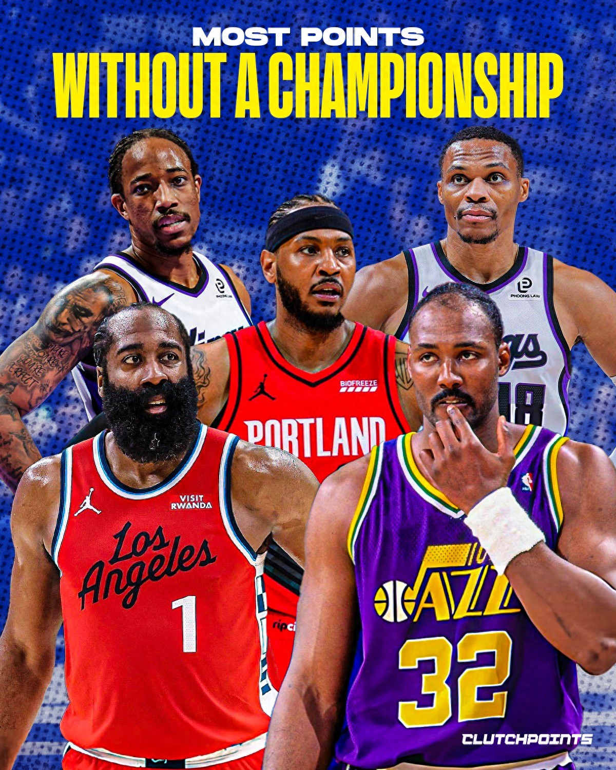 因為NBA歷史上還有很多偉大的得分手,他們雖說沒有拿到過總冠軍,可是論得分能力,有些球星,不亞于這些擁有總冠軍的球員。為此,美媒曬出了NBA歷史上沒有總冠軍的球員中,職業生涯得分最多的9人,其中威少、詹姆斯哈登和德羅贊三名現役球星都在這份名單中。
