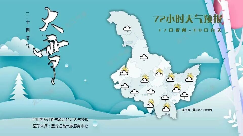 17日夜間到18日白天:大興安嶺、黑河、大慶、綏化南部、哈爾濱北部、雞西、牡丹江北部多云有陣雪,其他地區晴有時多云。