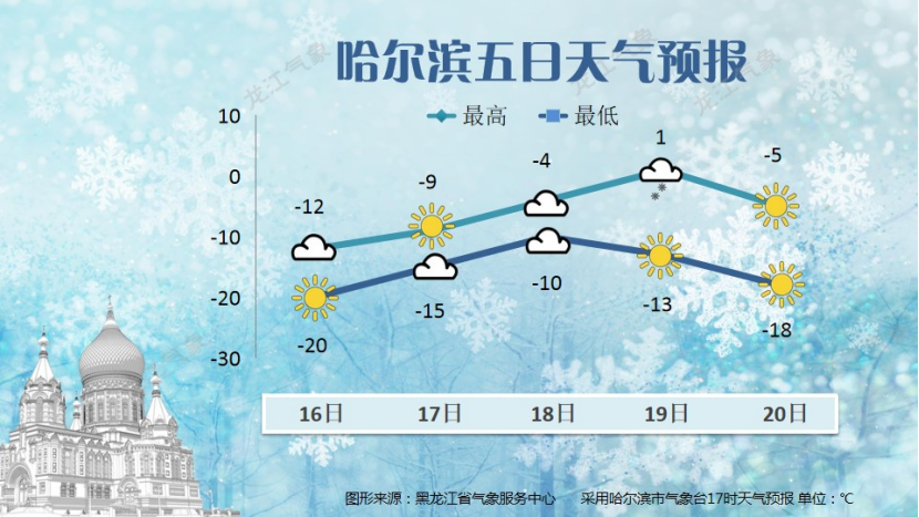 16日白天最高氣溫:大興安嶺北部-23~-21℃,大興安嶺南部、黑河、伊春-20~-18℃,齊齊哈爾、哈爾濱、七臺河、牡丹江-13~-11℃,其他地區-16~-14℃。