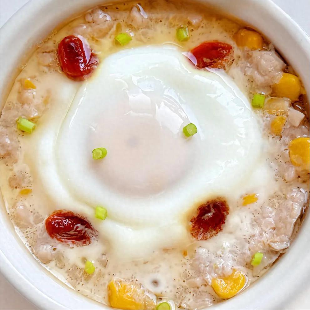 4、將雞蛋打入小坑里,確保蛋液不溢出,蒸鍋加水大火燒開,把蒸盤放進(jìn)去,中火蒸 15 分鐘。