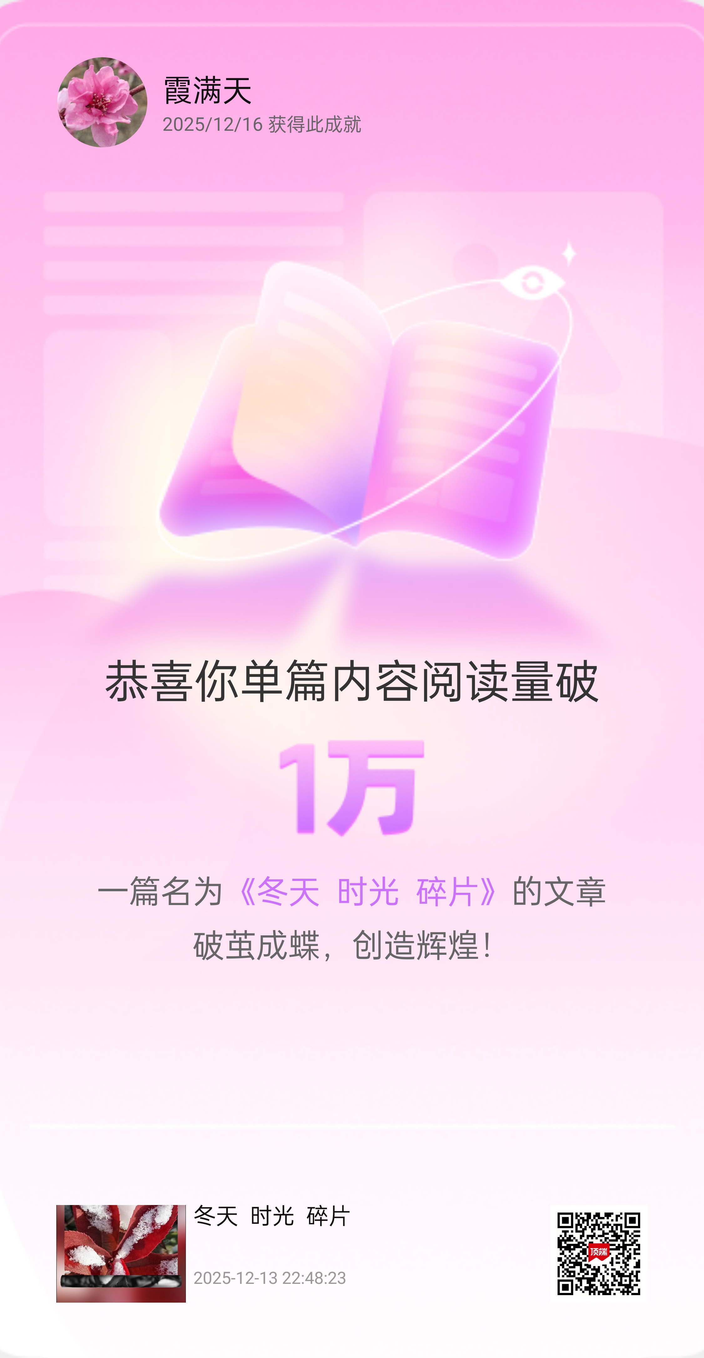 我的作品《冬天 時(shí)光 碎片》在頂端單篇閱讀超過(guò)10000了