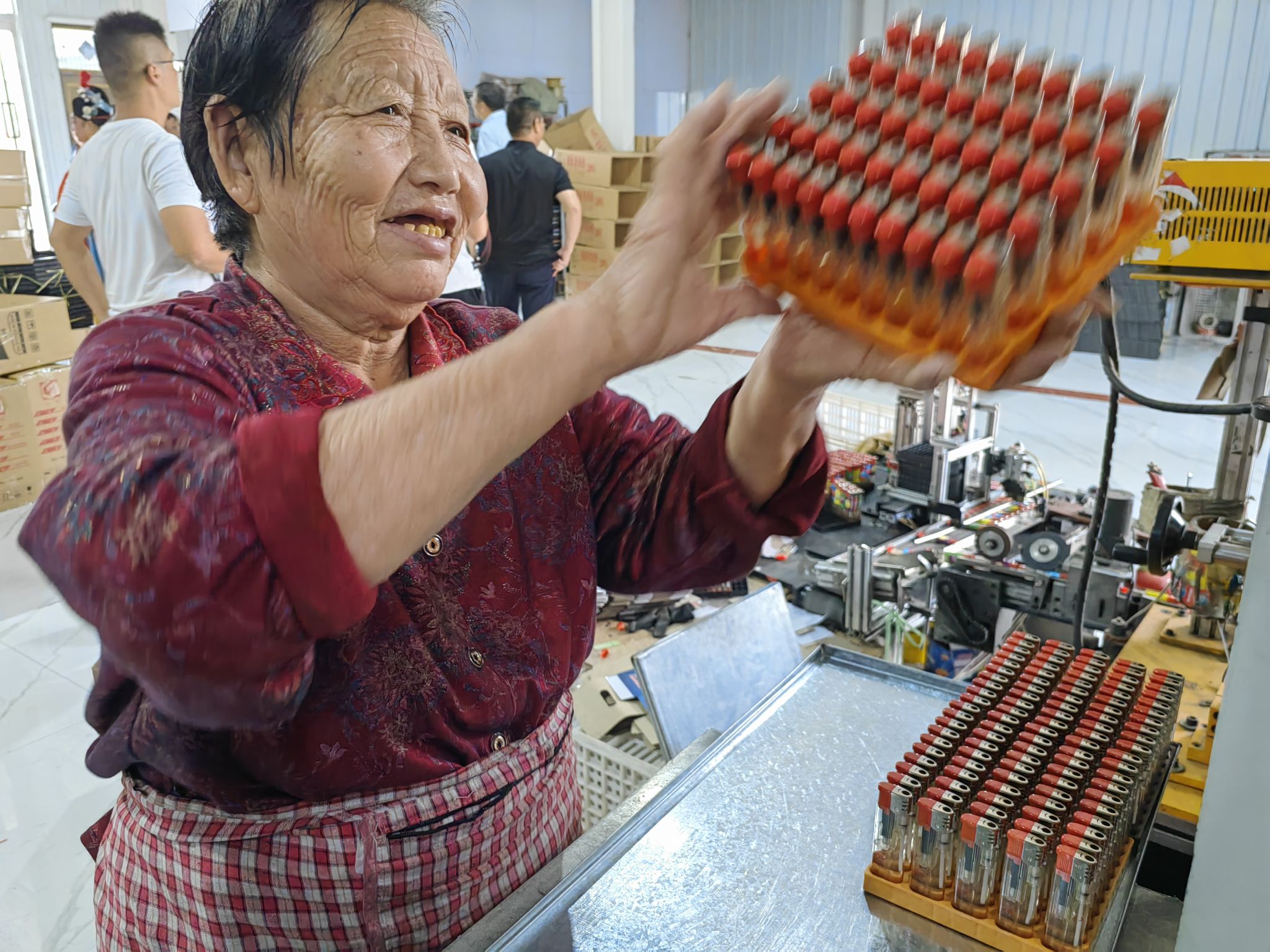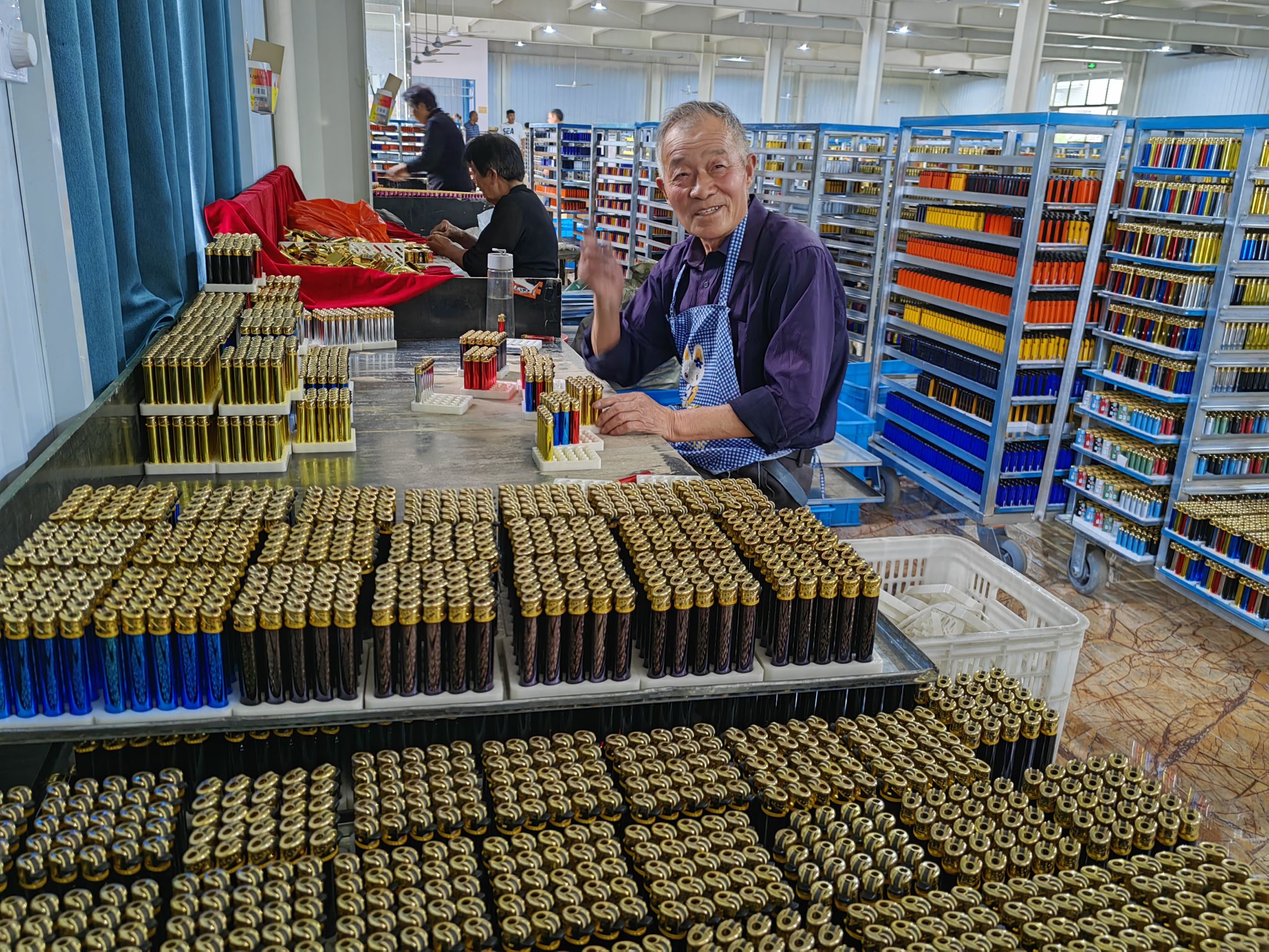 小小打火機,蘊藏大能量。據(jù)統(tǒng)計,會亭鎮(zhèn)打火機產(chǎn)業(yè)已形成集原材料供應、生產(chǎn)制造、包裝物流、電商銷售于一體的完整產(chǎn)業(yè)鏈,帶動當?shù)丶爸苓呧l(xiāng)鎮(zhèn)近萬名群眾就業(yè),其中不少是返鄉(xiāng)農(nóng)民工、留守婦女。“在家門口上班,每月能掙4000多元,還能照顧老人孩子,比外出打工強多了!”在港牌打火機車間工作的村民王大姐笑著說。