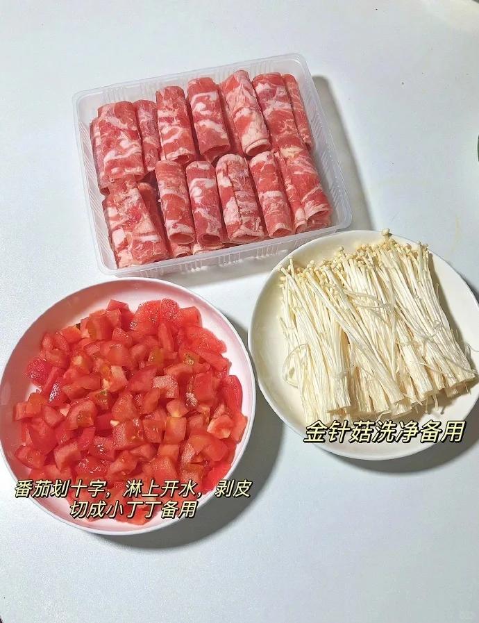 金針菇去掉根部,撕成小朵,用清水洗凈備用;肥牛卷提前從冰箱里拿出來解凍。