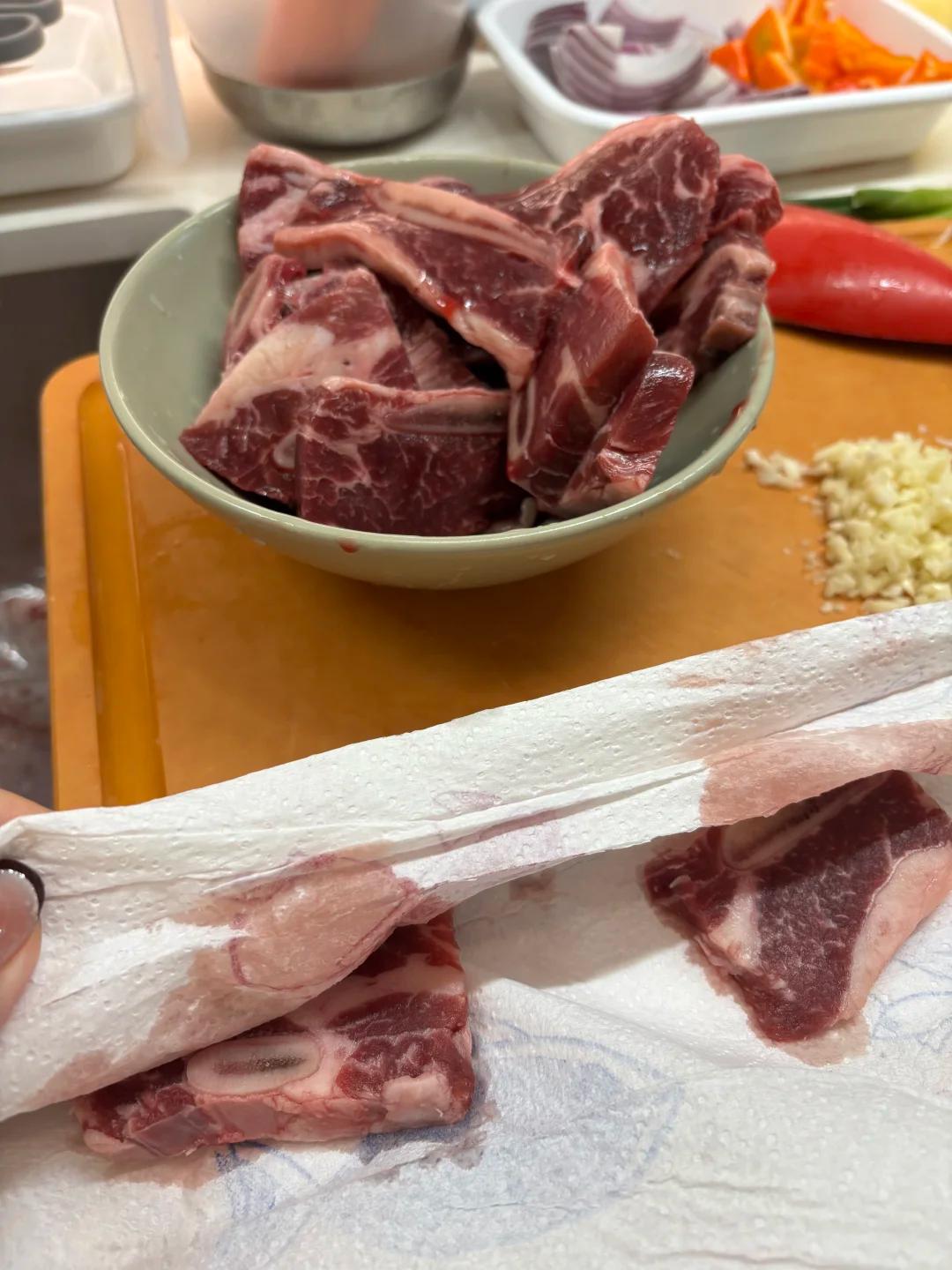 牛仔骨提前用清水沖洗干凈,用廚房紙吸干表面的水分,加一勺生抽、半勺紅酒、少許黑胡椒和蒜末,抓勻后腌制半小時,讓牛仔骨充分吸收調料的香味。