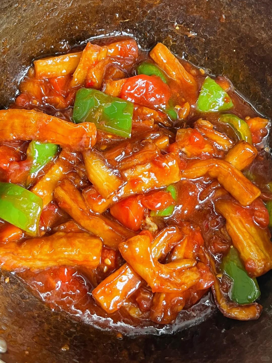 最后大火收汁,撒上蔥花就能出鍋,茄子吸滿了酸甜咸鮮的醬汁,軟而不爛,每一口都特別下飯。