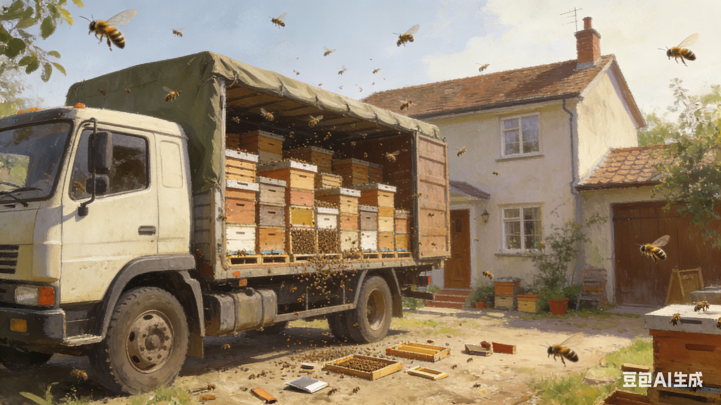 他的姑父打開了蜂箱,準備收獲蜂箱里的蜂蜜,此時的蜜蜂卻會保護它們的“糧食”的。蜜蜂們蜂擁而上,圍著養蜂人團團轉,卻是“狗咬汽車——無處下嘴”——姑爺爺帶著面罩呢。好奇的小叔叔——哦,他那時也只有三四歲——他蹣跚著步子,靠近了風箱,居然異想天開地想去捉一只蜜蜂玩耍。很快,蜂箱前便傳出了“哇哇”的孩子哭聲。