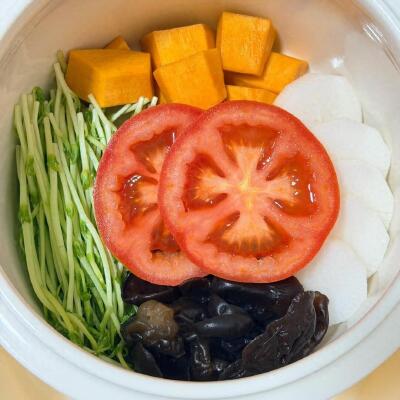 香菇泡發切丁。白蘿卜去皮切塊,鋪在盤中。