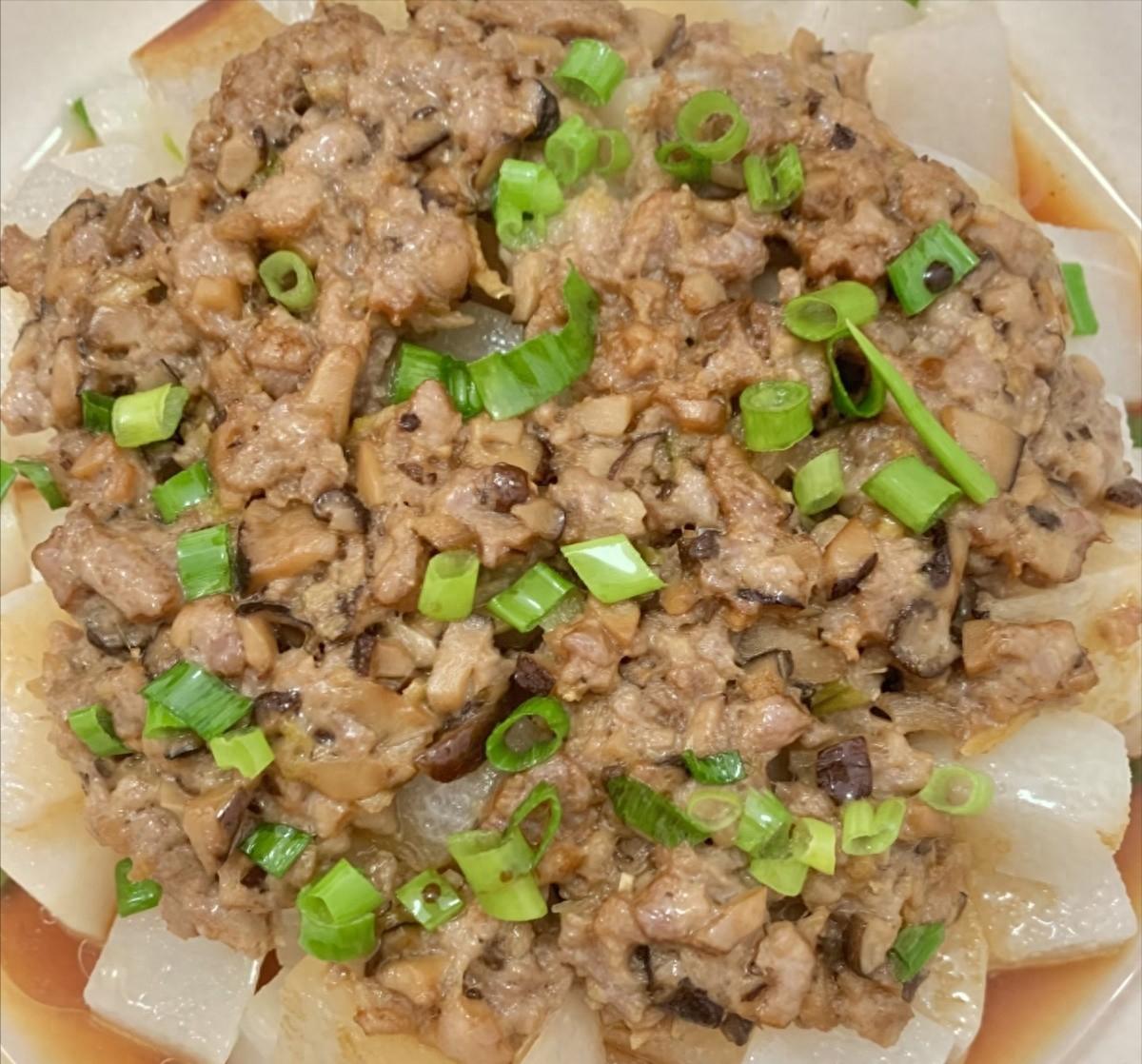 【食材】:白蘿卜,豬肉末,香菇,蔥花、姜末,生抽,蠔油,鹽、糖