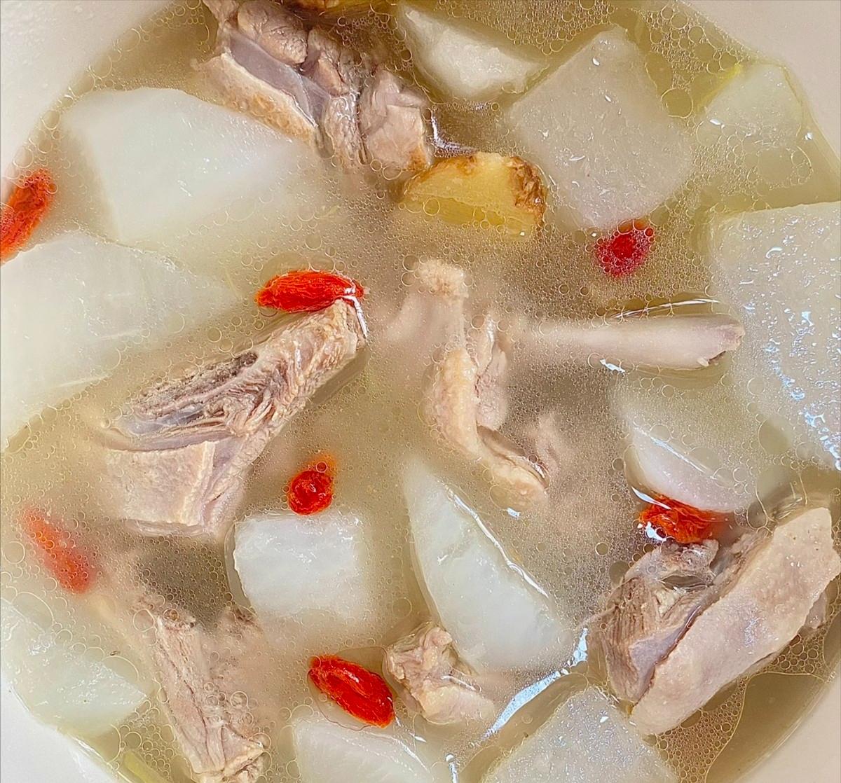 【食材】:老鴨半只,白蘿卜,枸杞,姜片,鹽