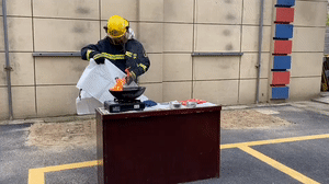 用滅火毯蓋上起火的油鍋后,油鍋上的火很快就滅了。滅火毯實際上是一個小包裝的防火袋,它最大的作用就是阻燃。