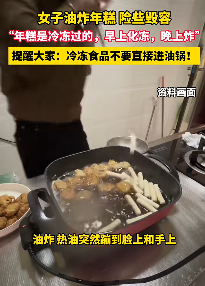 2025年12月4日,安徽界首一名女子在家油炸年糕,沒想到剛把年糕下鍋,熱油就 “猛撲” 到她臉上、手上,險些毀容。