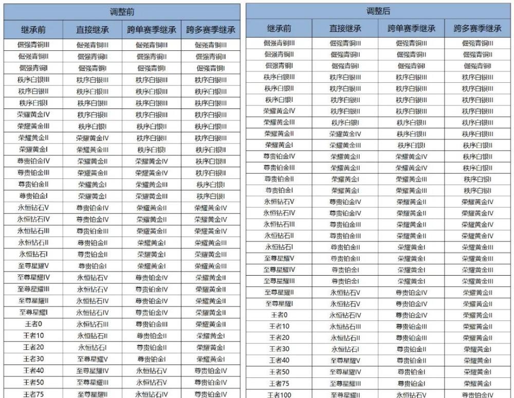 王者30星的玩家原本可以繼承到星耀段位,現在只能繼承到鉆石一。想要在新賽季起步就在星耀五段位,本賽季必須達到王者40星以上,而此前僅需王者30星。