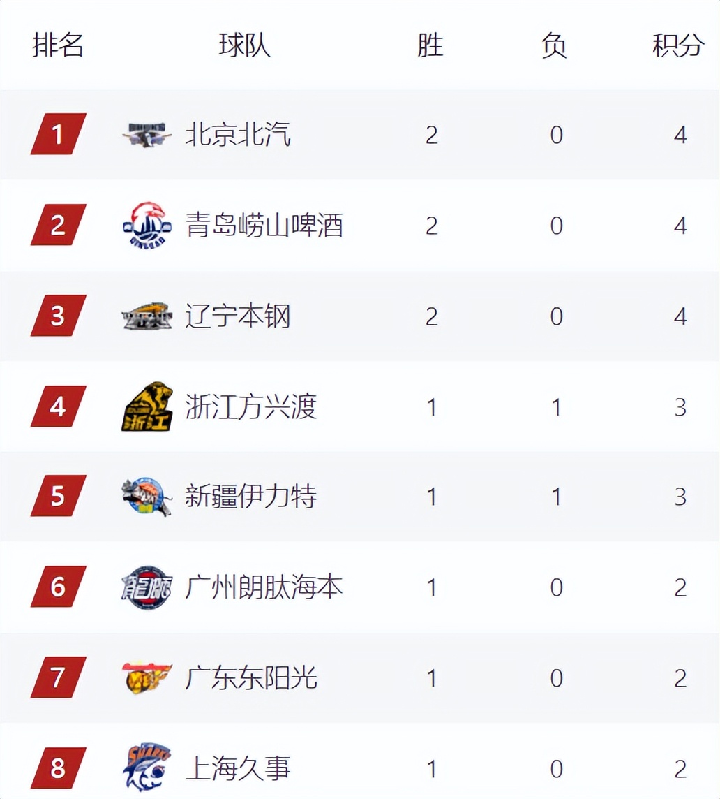 衛(wèi)冕冠軍廣廈這一戰(zhàn)雖然輸給了遼寧隊,不過,憑借著先賽一場的優(yōu)勢,廣廈還是暫居積分榜第四的位置。新疆隊則緊隨其后,他們以1勝1負的戰(zhàn)績,排在積分榜第5的位置。積分榜第6名的則是廣州隊,上一輪比賽他們還是積分榜第3名,不過,遼寧、北京等隊贏球后,廣州隊被擠出前四了。而廣東隊的排名則上升了,此前他們排在積分榜第10位,這一輪過后,他們的排名上升到積分榜第7。