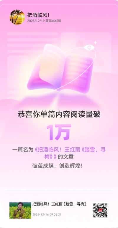 文字里既有對冬雪美景的由衷贊嘆,也有對梅花疏影暗香、凌寒獨綻風骨的深深敬佩,更藏著對純粹靈魂境界的追尋。踏雪尋梅,尋的是自然之美,是詩韻之雅,更是精神之境。這篇散文如一杯清茗,淡雅回甘,帶領讀者在雪與梅的邂逅中,感受跨越千年的審美共鳴與心靈澄澈。