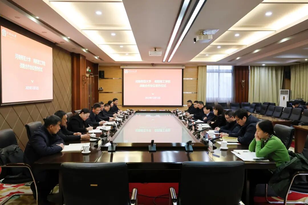 ■12月12日上午,河南師范大學與南陽理工學院戰略合作協議簽約儀式舉行。南陽理工學院校長郝好山、副校長黃金書,河南師范大學校長郭海明、副校長楊玉珍出席簽約儀式。楊玉珍與黃金書代表雙方共同簽署了《河南師范大學 南陽理工學院 戰略合作協議》。隨后,兩校相關部門負責人就合作事宜進行了深入交流探討。