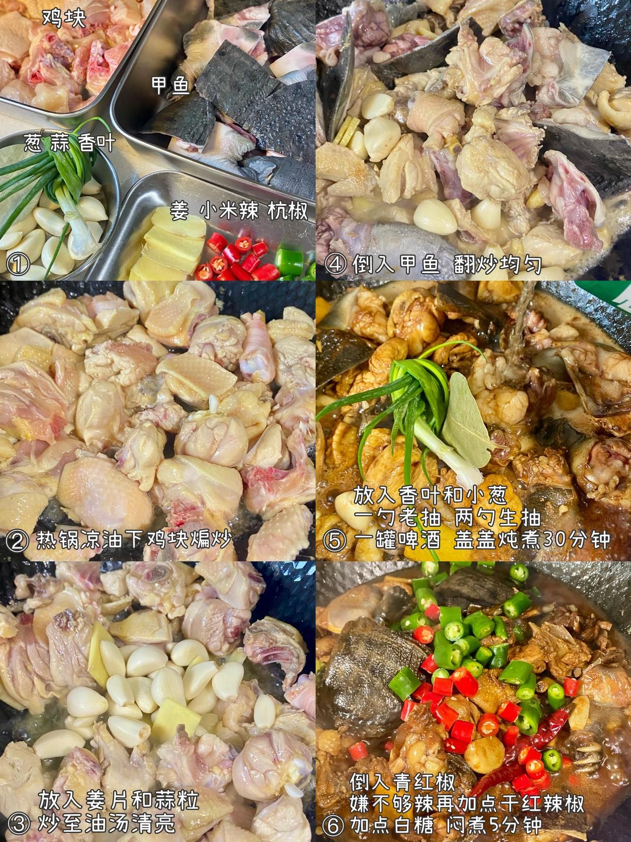 食材:甲魚、雞塊、蔥、姜、蒜、香葉、辣椒、啤酒、老抽、生抽、白糖