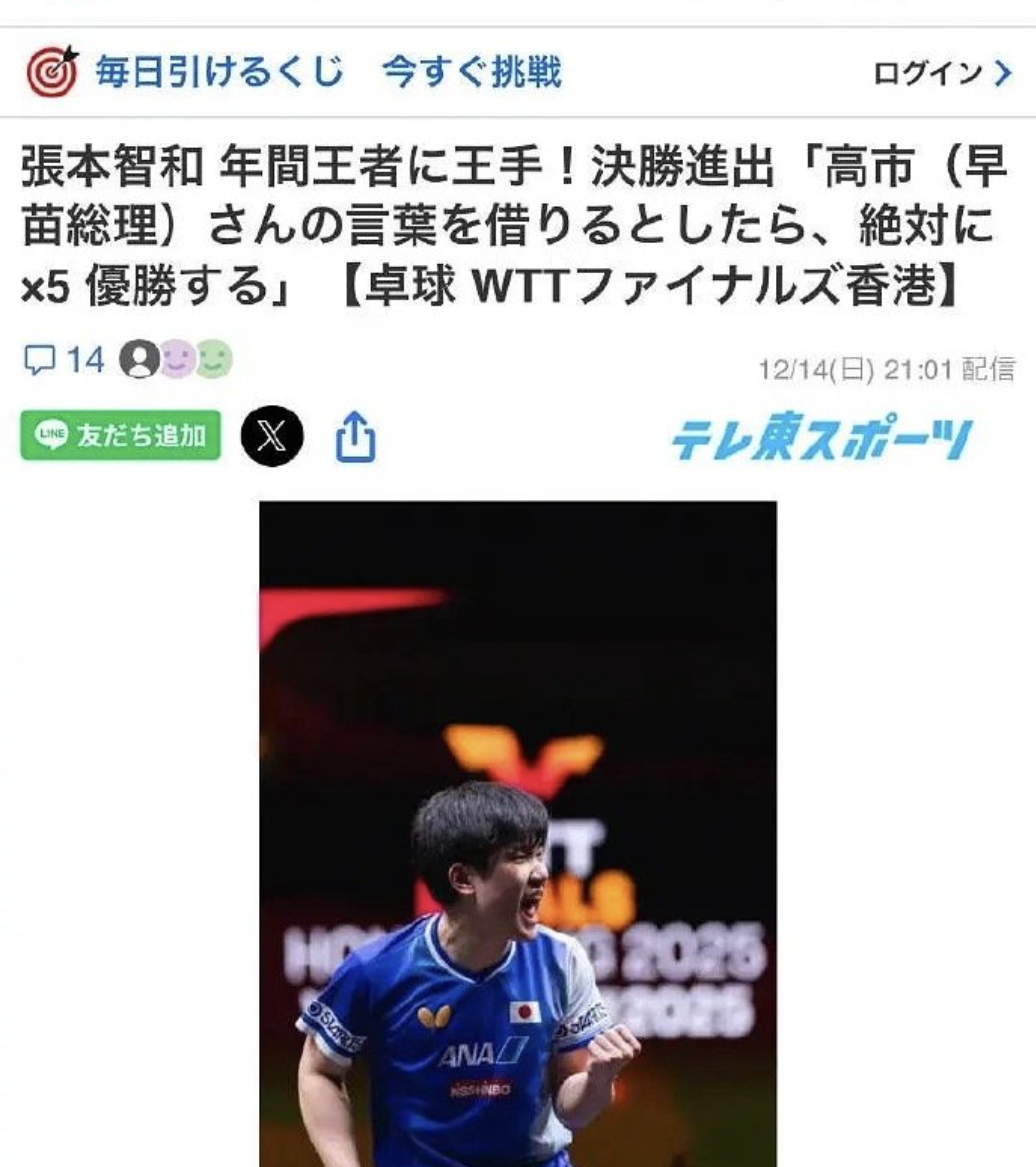 12月14日晚,日本選手張本智和在WTT總決賽中獲得了男單冠軍,這是他生涯首次獲得這一榮譽,賽后他進行了瘋狂的慶祝。值得一提的是,他在賽前曾在采訪中引用日本首相高市早苗的言論。