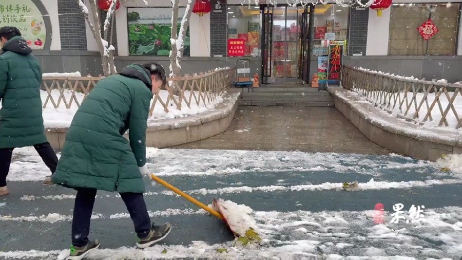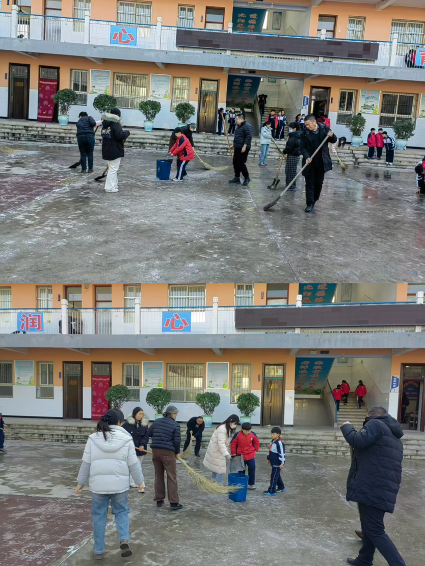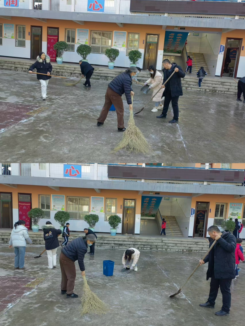 凜冽寒風中,老師們的臉頰被凍得通紅,雙手磨出了薄繭,鞋子早已被冰雪浸濕,但沒人停下腳步。有人摔倒了爬起來拍拍雪繼續干,有人累得氣喘吁吁仍笑著接力,領導與教師并肩作戰,不分你我,用熱情融化著冬日的嚴寒。經過數小時奮戰,校園內外的積雪冰層被徹底清理,一條條干凈通暢的"平安路""暖心路"蜿蜒在校園中,為孩子們的安全出行筑牢了防線。