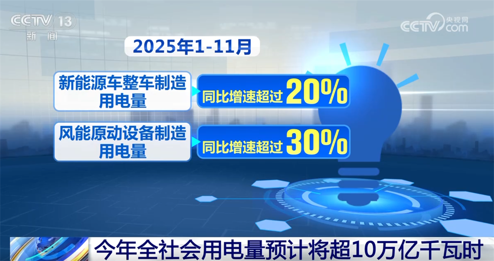 10萬億千瓦時的背后,顯示中國經(jīng)濟的澎湃活力。今年以來,高技術及裝備制造業(yè)用電增速持續(xù)領跑,據(jù)預測,1—11月新能源車整車制造、風能原動設備制造等細分領域同比增速分別超過20%和30%。1—11月,互聯(lián)網(wǎng)和相關服務業(yè)用電量同比增速超30%,充換電服務業(yè)用電量同比增速近50%。