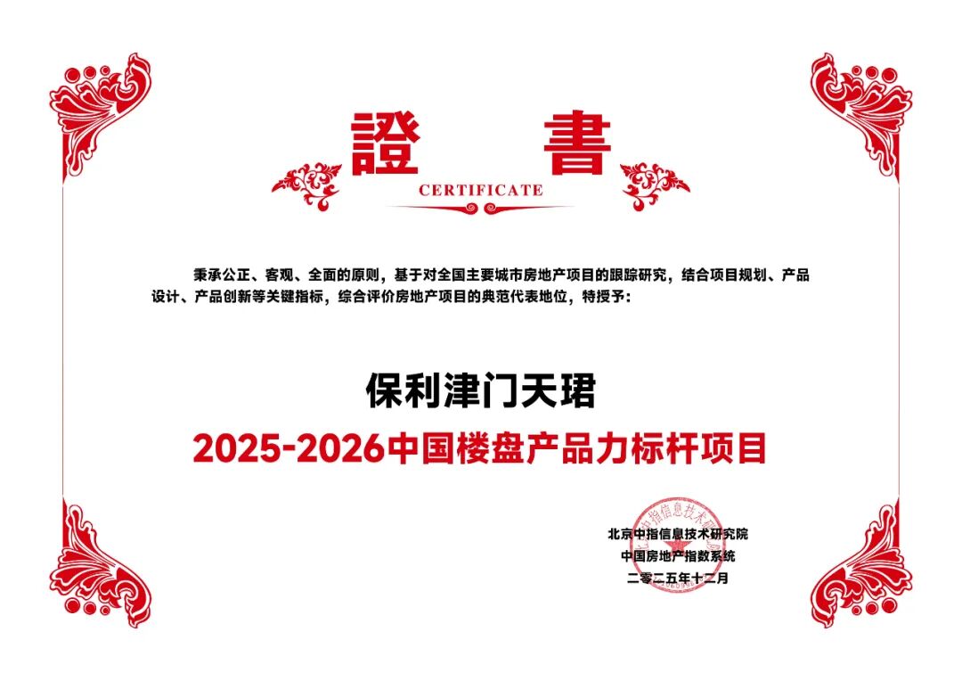 中指研究院基于項目規(guī)劃、產(chǎn)品設(shè)計、居住品質(zhì)、產(chǎn)品創(chuàng)新等數(shù)十項核心指標對保利津門天珺項目進行全方位考量,并于11月啟動2025年人居夢想好房子研究與優(yōu)選工作,通過專家評審與網(wǎng)絡(luò)票選相結(jié)合的方式,對保利津門天珺項目的綜合實力進行權(quán)威認證。這既是對其綜合實力的高度肯定,更印證了其作為保利好生活營造體系落地天津的標桿成果,將集團“以客戶為中心、以好生活為綱”的理念具象化呈現(xiàn)。