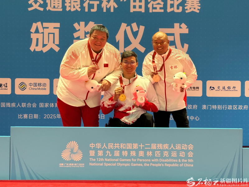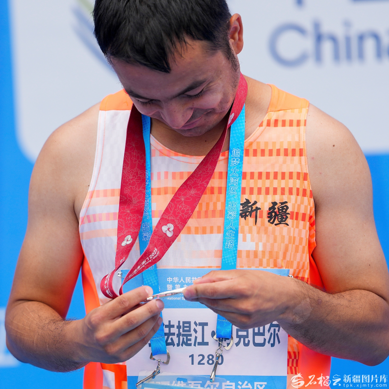 12月10日,在男子30歲以上組400米決賽頒獎儀式上,獲得亞軍的新疆隊選手阿爾法提江·阿克巴爾查看獎牌。殘?zhí)貖W會官方信息服務平臺供圖