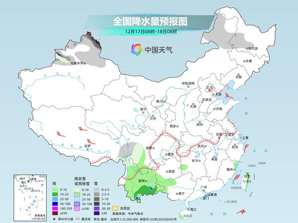 后天,內蒙古東北部、黑龍江中北部、新疆北部和南疆西部山區、甘肅河西等地部分地區有小到中雪或雨夾雪,其中,新疆沿天山地區和伊犁河谷局地有大到暴雪。湖南南部、福建東部和南部、西南地區南部、廣西西南部、廣東東部和南部、海南島東部、臺灣島東部等地部分地區有小到中雨,其中,廣東東部局地有大雨。