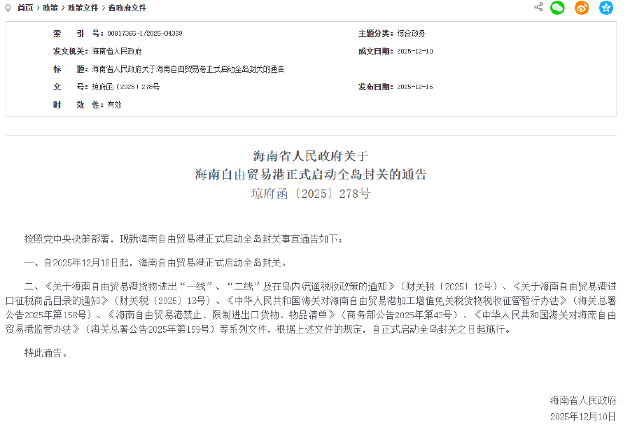 通告稱,自2025年12月18日起,海南自由貿易港正式啟動全島封關。