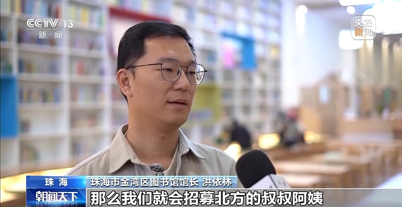 珠海市金灣區圖書館館長 洪依林:有不少老人帶著小孩也會來到我們圖書館閱讀,那么我們就會招募北方的叔叔阿姨,加入我們的志愿服務隊,讓他們以“老鄉”的身份,更好地去服務我們的北方讀者,增加他們的親切感和歸屬感。