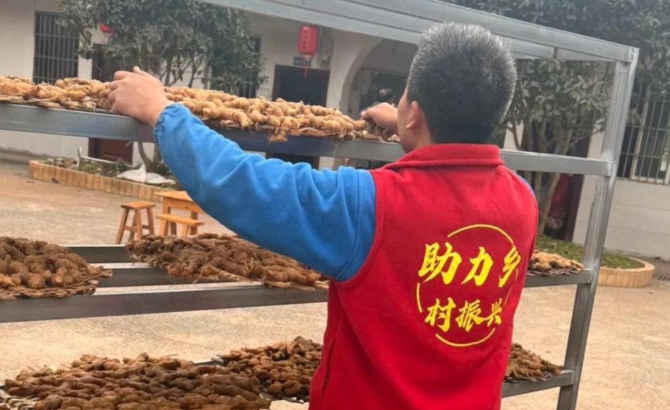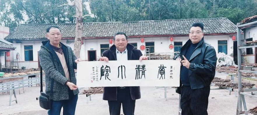 2025年12月,國畫名家章明賢專為老村長所題的字畫在泥巴寺小學處展示,墨筆與架上的黃精干相映成趣。