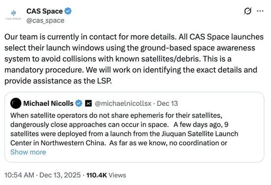 12月10日,中科宇航力箭一號(hào)遙十一運(yùn)載火箭發(fā)射成功,將9顆衛(wèi)星送入預(yù)定軌道。中科宇航在后續(xù)回應(yīng)中進(jìn)一步補(bǔ)充關(guān)鍵信息:如果此次近距離接近事件被證實(shí),它發(fā)生在衛(wèi)星有效載荷分離近48小時(shí)后,彼時(shí)發(fā)射任務(wù)早已結(jié)束。