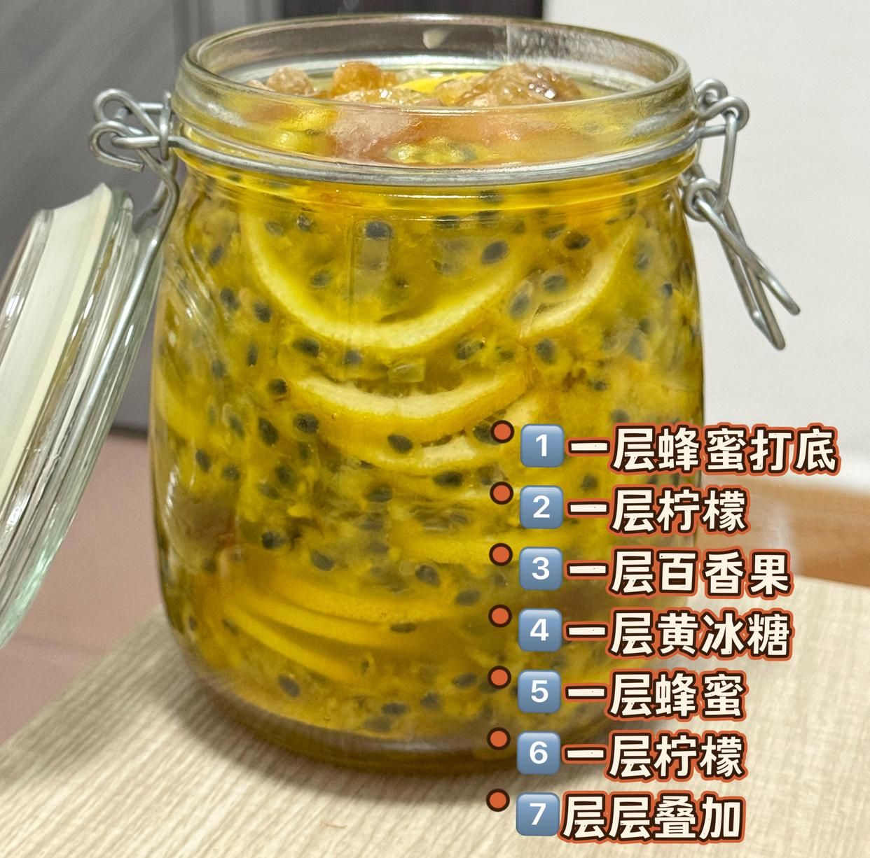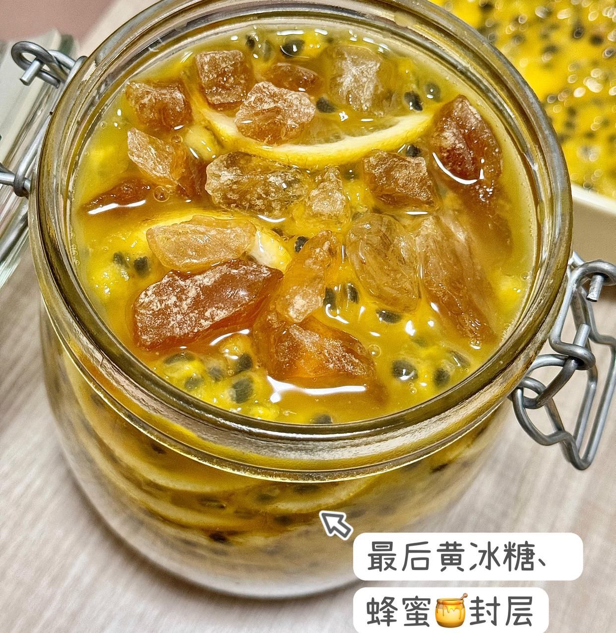 裝好的罐子蓋緊蓋子,放冰箱冷藏層(4℃左右)。別著急喝,得等3-5天,讓黃冰糖完全融化,食材的味道融合在一起。這時候打開罐子,能聞到濃郁的果香,蜂蜜變得透亮,檸檬和百香果都軟乎乎的,就可以喝啦~