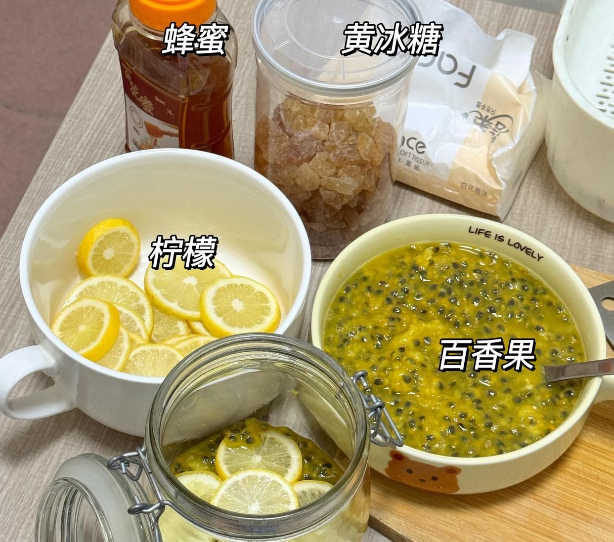 食材:檸檬、百香果、純蜂蜜、老黃冰糖