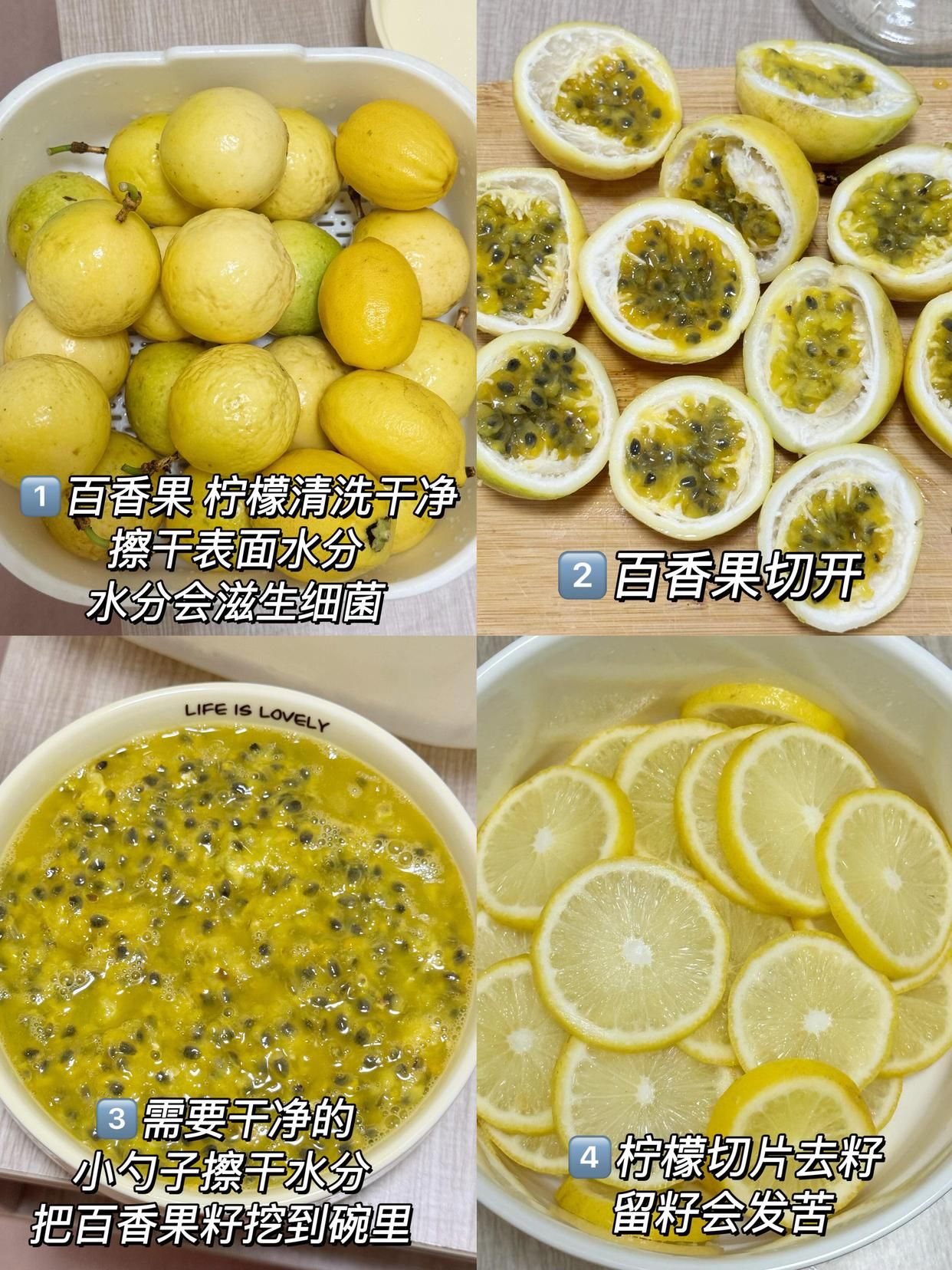 檸檬先用鹽搓洗表皮(去除蠟和臟東西),再用清水泡10分鐘,撈出來擦干(一定要擦干,不然有水容易壞)。然后切片,記得去籽(不然泡出來會發苦,影響口感)。百香果從頂部切開,用勺子把果肉挖出來(連籽一起挖,百香果籽富含維E,別浪費)。
