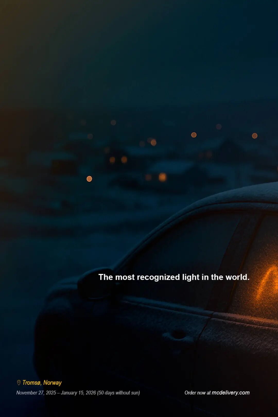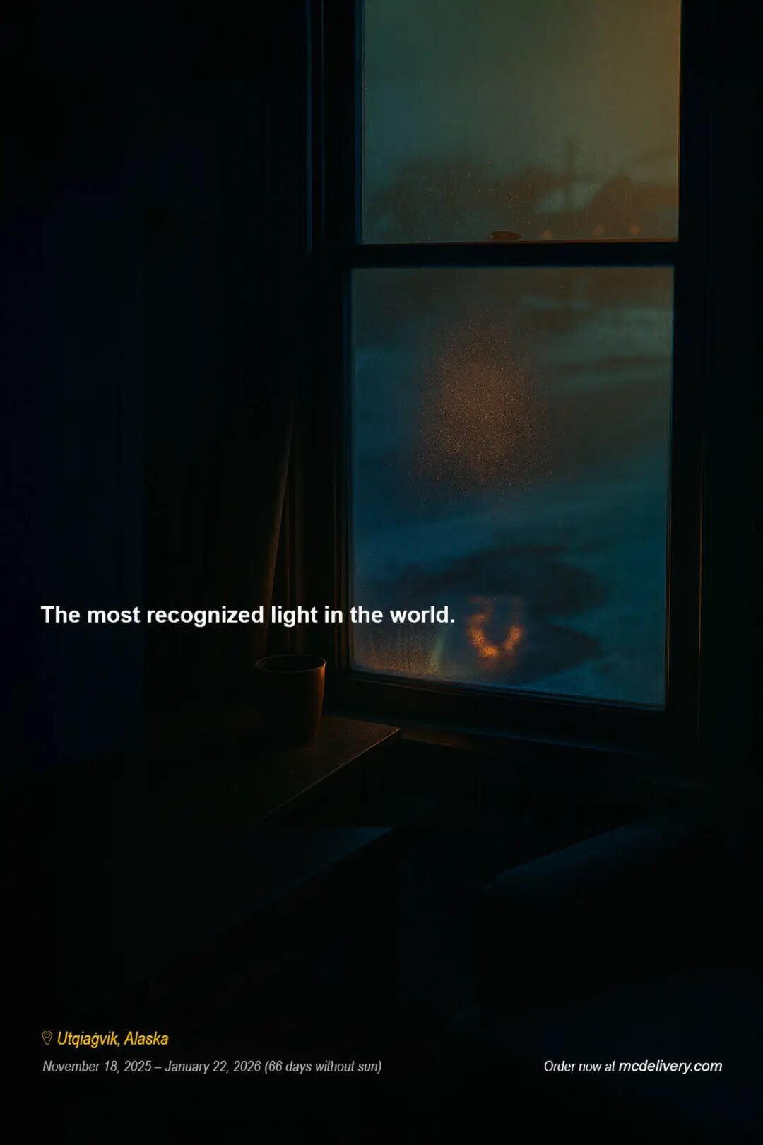 無標志、無食物、無多余文案,僅呈現地點、極夜日期及概念性行動號召,以氛圍塑造品牌,憑場景與情感凸顯辨識度,印證品牌在大眾視覺記憶中的深厚根基 —— 有時,靜靜發光便足以被看見。