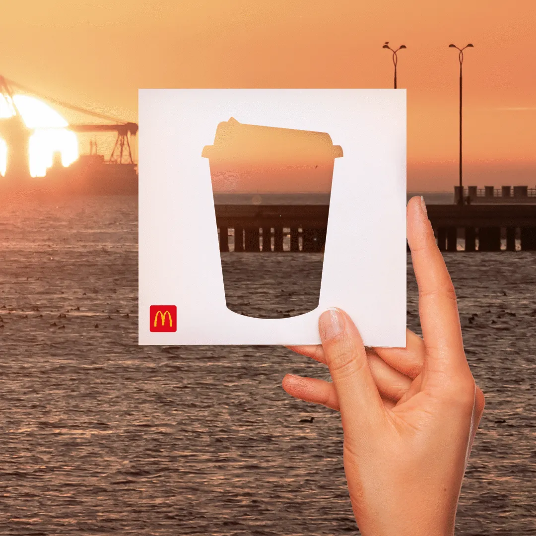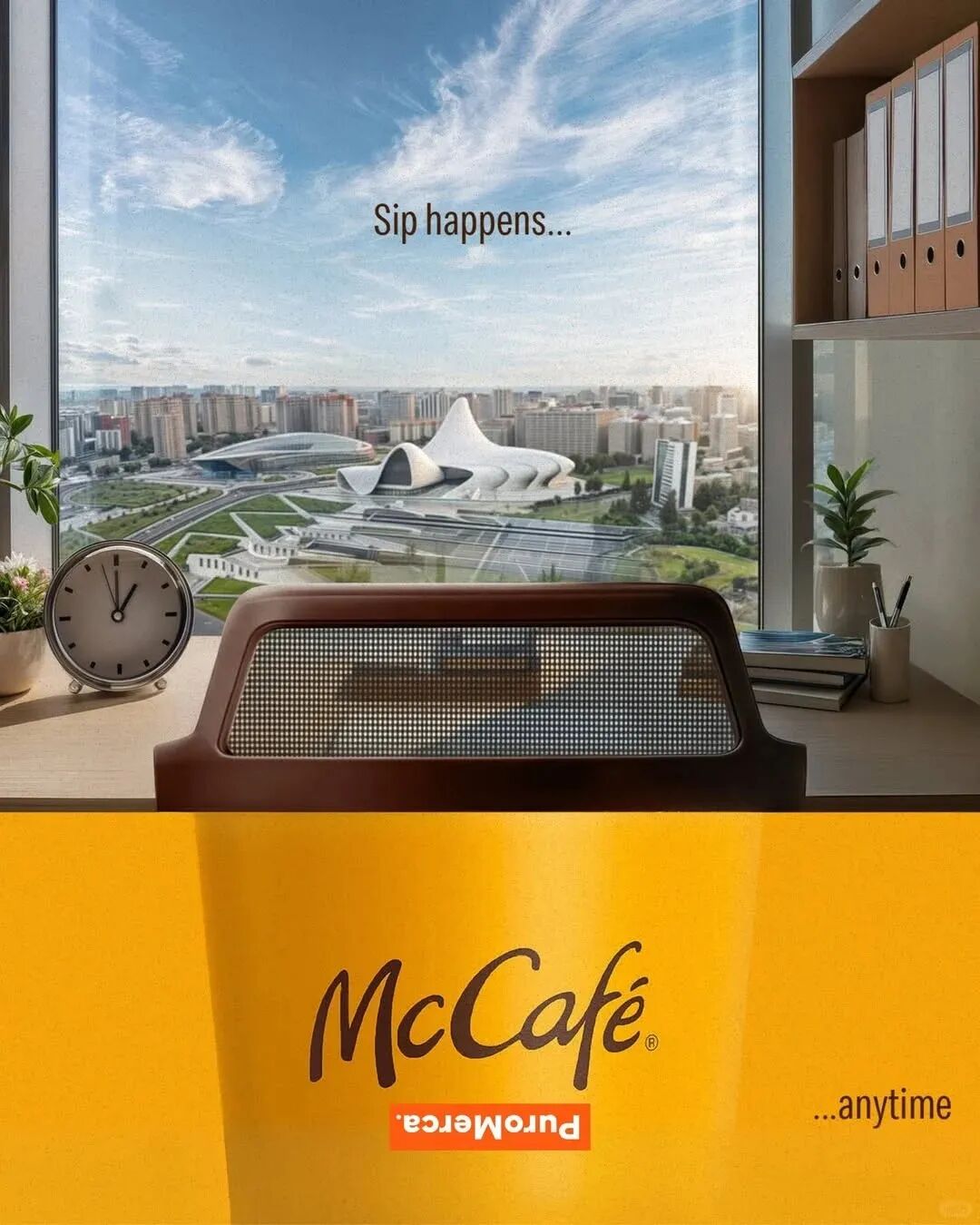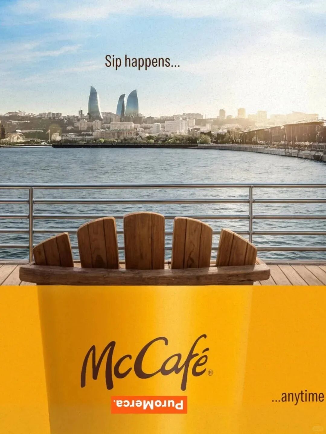 阿塞拜疆麥咖啡的海報就深諳此道:辦公椅的靠背弧度與咖啡杯身自然銜接,居家沙發的扶手與杯柄渾然一體,休閑躺椅的線條更是與杯身輪廓精準契合,背景疊印的巴庫地標,讓這份適配感多了地域歸屬感。