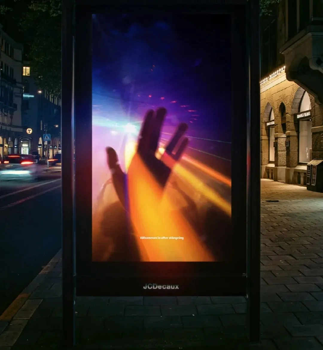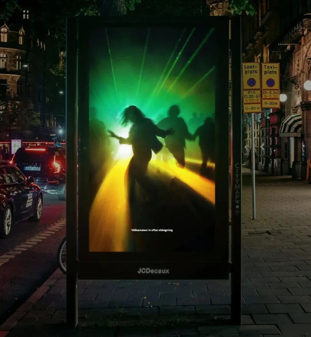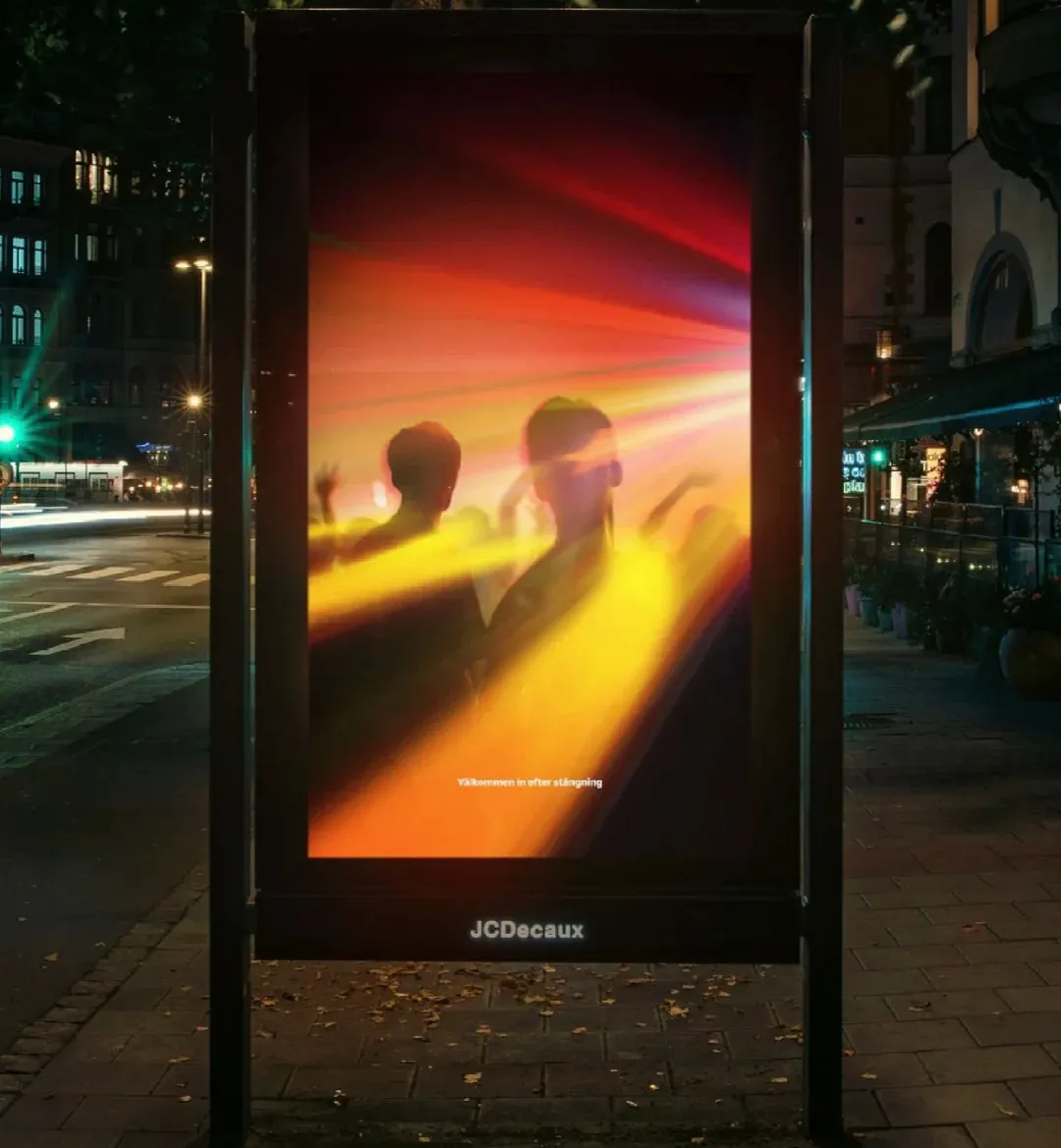 最近瑞典的 “夜店風” 海報直接殺瘋,把廣告牌懟到夜店、酒吧門口,沒有顯眼的金拱門 LOGO,全靠光怪陸離的霓虹光影交織出 M 形輪廓,蹦迪選手秒懂 “派對沒散場,麥門續一頓才圓滿”,視覺炸裂還自帶餓意。
