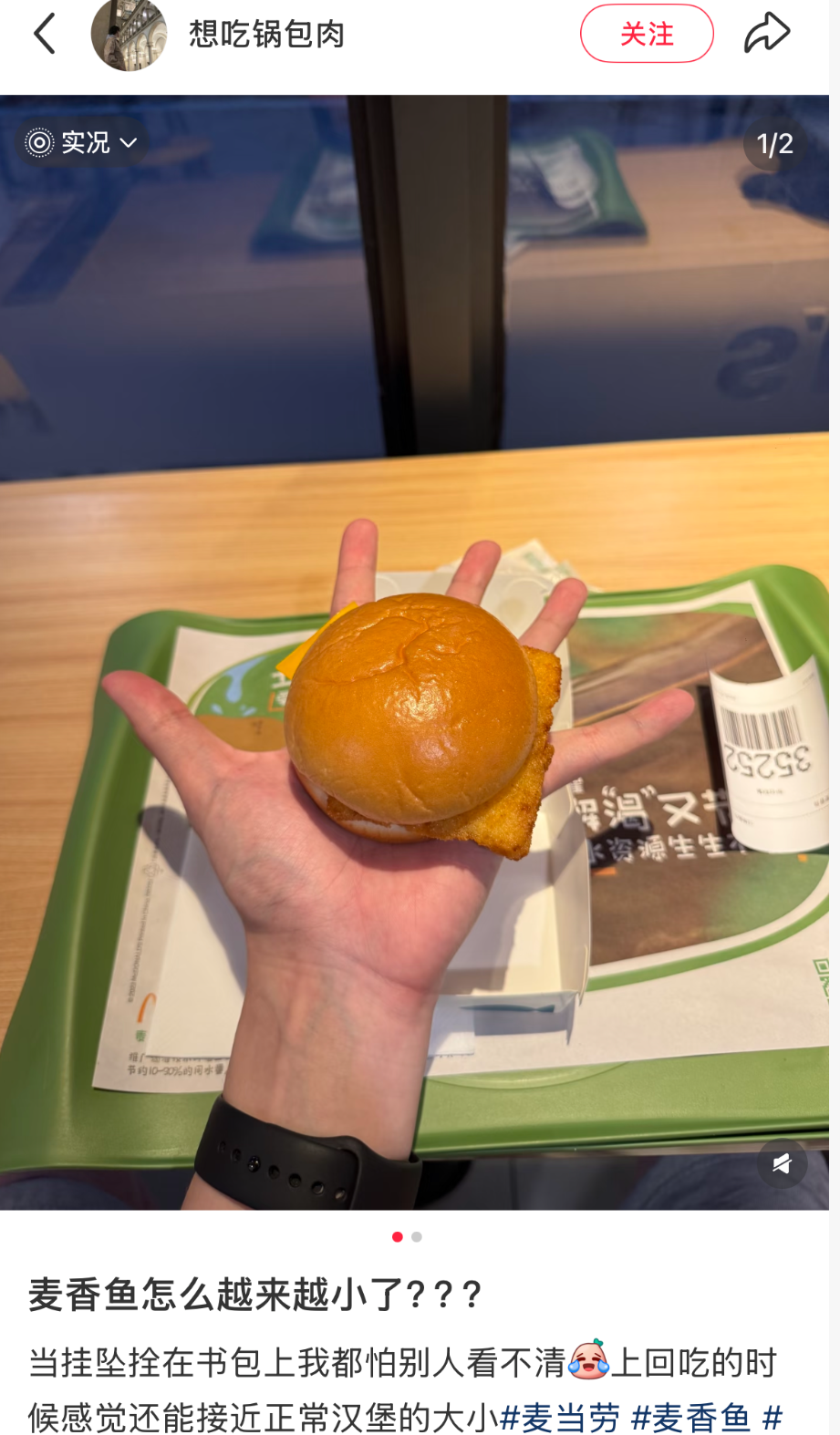 更核心的不滿在于 “雙重打擊”:麥辣雞腿堡面包變薄、生菜變少,中薯條再也不冒尖,曾經 “量大管飽” 的標簽逐漸模糊