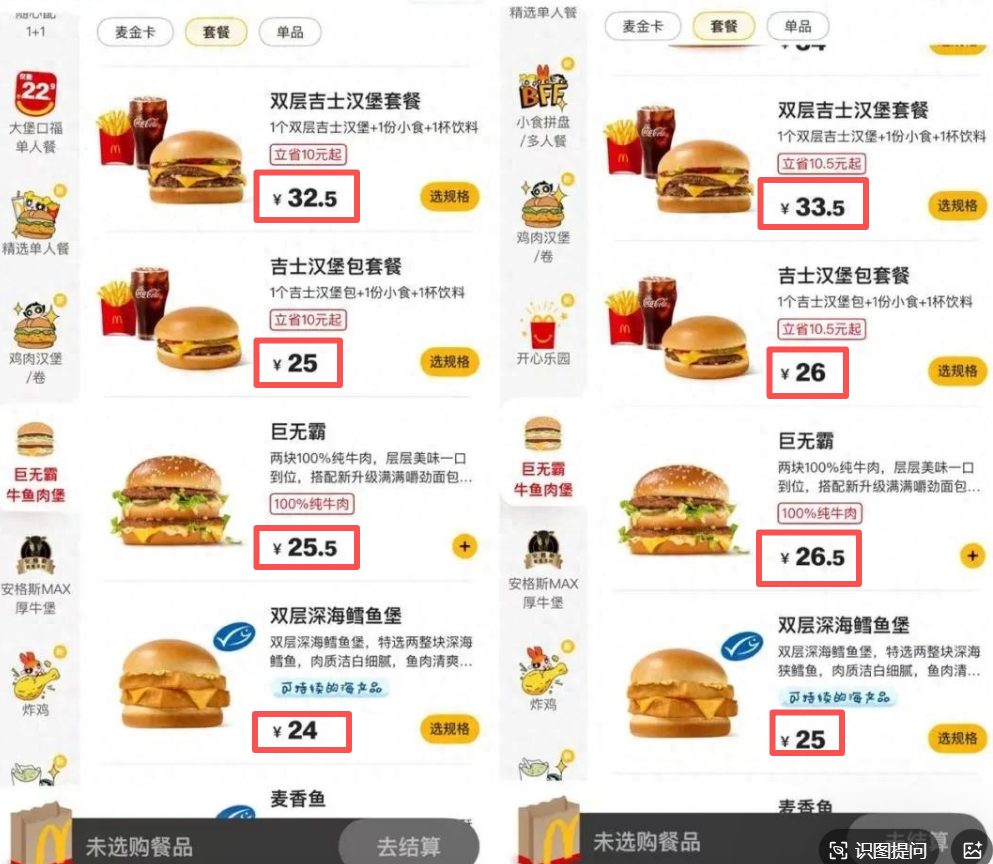 繼 11.9 元 “窮鬼套餐” 漲到 13.9 元后,麥當勞 2025 年末再啟漲價模式:12 月 15 日起,雙層吉士漢堡、巨無霸提價 1 元,麥麥脆汁雞、中薯條等漲 0.5 元,沒有官宣只有小程序價簽悄悄變動,精準戳中打工人的焦慮神經。