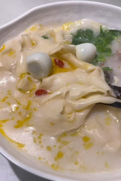 河南特色美食燴面,葷素湯都有,面條筋道湯味鮮美,還有倆鵪鶉蛋