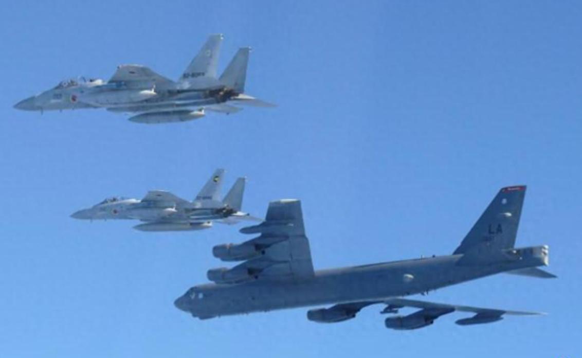 緊接著,美國(guó)派出兩架B-52戰(zhàn)略轟炸機(jī),聯(lián)合日本三架F-35隱形戰(zhàn)斗機(jī)、以及三架F-15戰(zhàn)斗機(jī),一同飛越日本海上空。