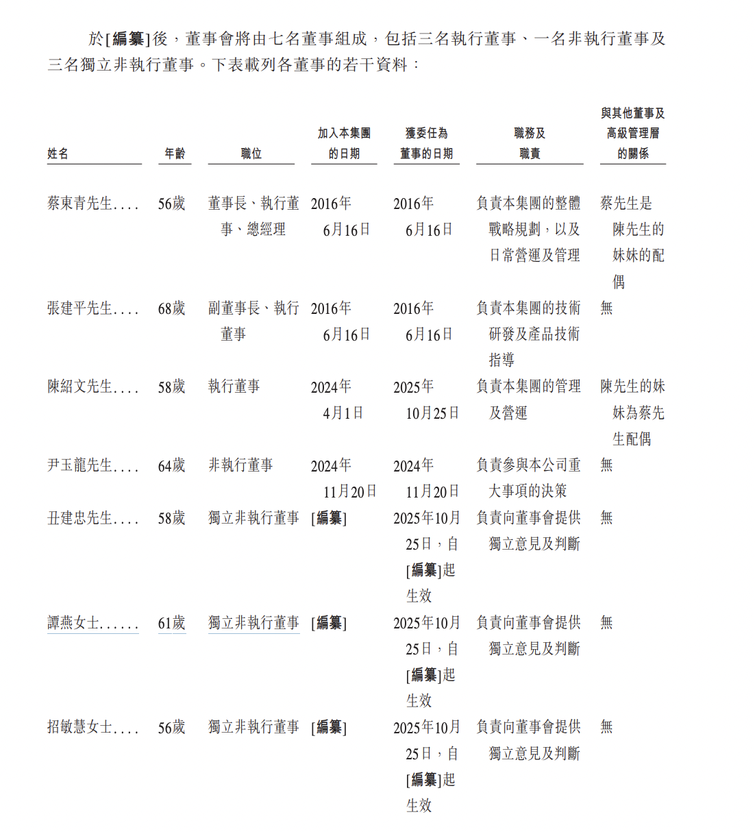瑞財(cái)經(jīng)注意到,陳紹文、丑建忠、譚燕、招敏慧均自2025年10月25日獲委任為董事。陳紹文的妹妹為蔡?hào)|青配偶。