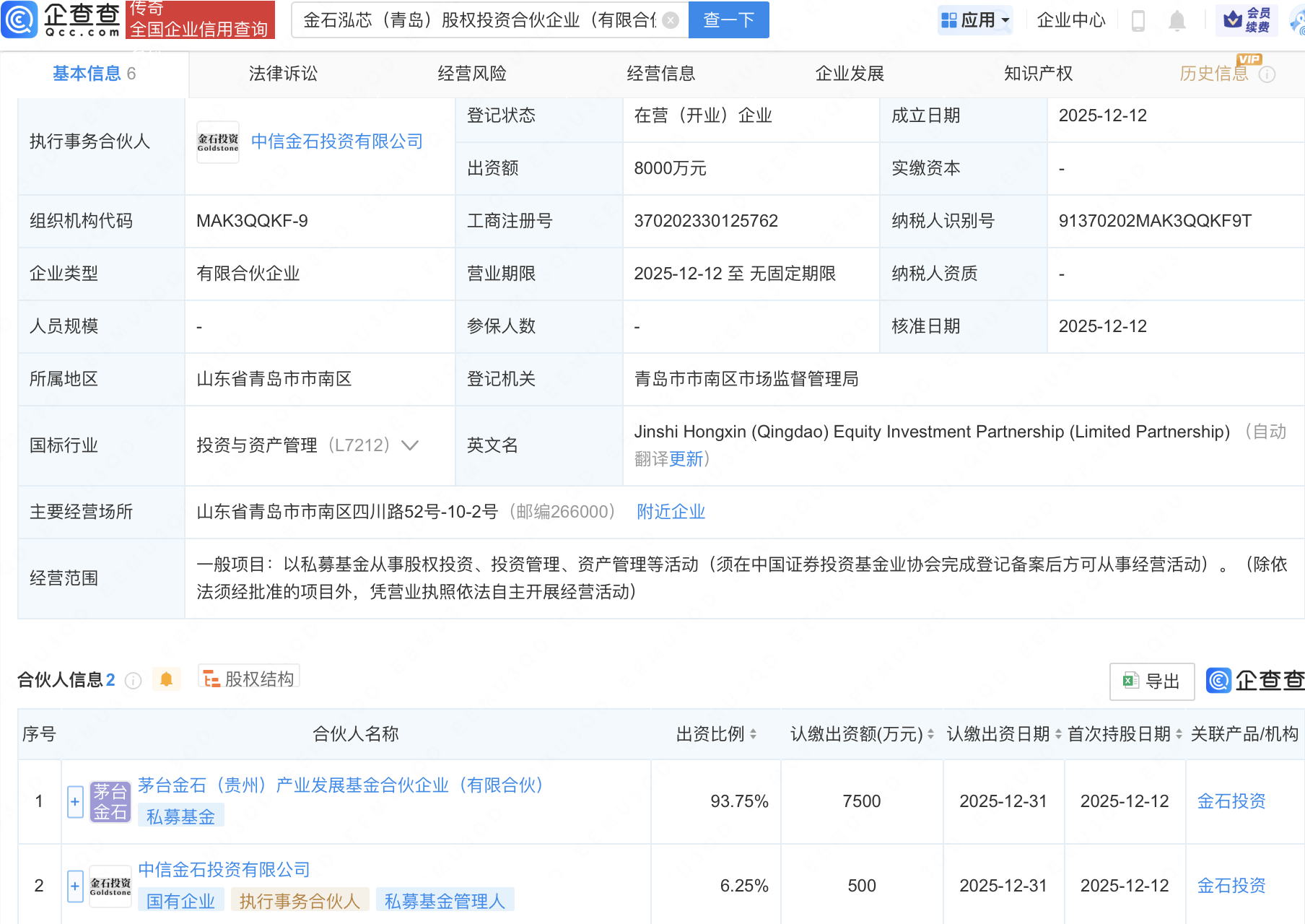 企查查APP顯示,近日,金石泓芯(青島)股權投資合伙企業(有限合伙)成立,出資額8000萬元,經營范圍包含:以私募基金從事股權投資、投資管理、資產管理等活動。企查查股權穿透顯示,該企業由茅臺金石(貴州)產業發展基金合伙企業(有限合伙)、中信金石投資有限公司共同出資。