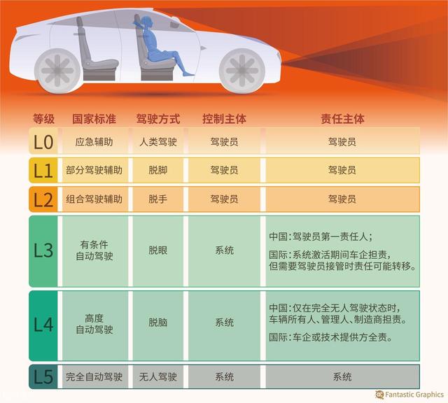 我們再講白點,“L2”階段司機必須全程緊盯,“L3”可以短暫脫手但需隨時接管,“L4”特定場景可以無需司機;“L5”則徹底告別方向盤。