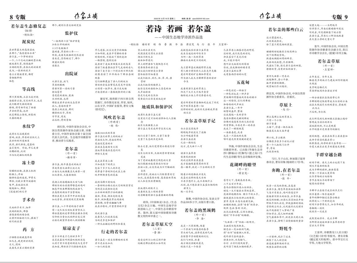 今天的《作家文摘》報以兩個整版的通版形式,發表中國生態地學詩派作品選,刊發胡紅拴、謝安軍、胡偉、魯微、華海、蔣宜茂、馬行、張牛、王富祥詩寫若爾蓋生態及若爾蓋生態治理的詩歌作品。謝!??![抱拳][抱拳][抱拳][玫瑰][玫瑰][玫瑰]
